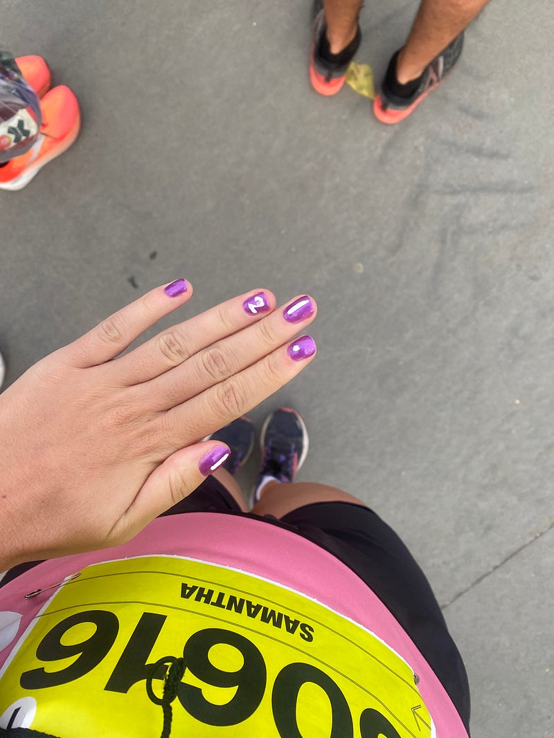 In the remaining days before the marathon, I was rethinking everything. Why did I sign up for this? And more importantly, why did I have to tell everyone I know — from my boss to my nail technician — I was doing it? At the nail salon a month before, the technician had offered to do marathon-themed nails for me, but my doubts led me to cancel my appointment. How embarrassing would it be to get my nails done and end up not completing it? As the big day got closer, I tried to avoid talking about the subject as much as possible.