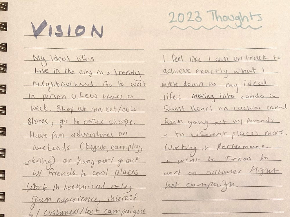 These will be the big milestones you use to measure your success or your progress at the beginning of next year. The key to goal-setting is being specific. It should be easy to identify if you’ve accomplished each item when you look back on your year. So, instead of writing down “Get in shape” or “Save money”, aim to “Run 10k without stopping” or “Put away 5000$ in your TFSA account”. The idea is that at any time you can go through your list and identify if each goal has been accomplished yet. If your goal isn’t specific enough — something like “Go to the gym more” — it will be difficult to tell if you are on track or even if you accomplished it at all. You probably have gone to the gym some times, but probably not every day. How much is “more” anyway?
