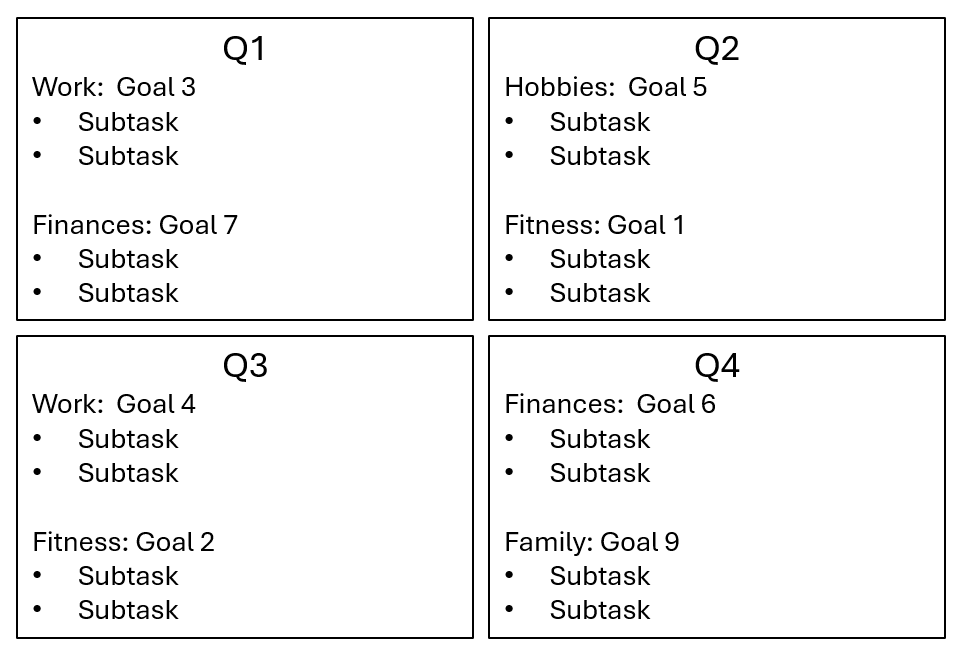 At this point, you should have a few categories with one or two big goals in each. Think about what steps you need to take to achieve the goals. For example, if your goal is to buy a car, you will probably need to do some research, choose what car you want, save some money, meet with dealers, and so on. Start with Q1 and pick one to three goals to focus on in the next three months, identifying subtasks needed to make progress. Another reason why using quarters is powerful, is it allows you to compartmentalize and focus. By choosing a few goals to focus on, you can essentially “forget about” the others, knowing they will be slated in a later quarter. If you have some time sensitive goals — a vacation you want to take in the summer or a race to run in the fall — note where they fall in the calendar and slate your preparation in the appropriate quarter.